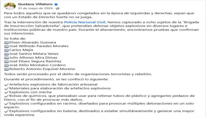 “Para todos aquellos que se quedaron congelados en la época de izquierdas y derechas, sepan que con un Estado de Derecho fuerte no se juega. Tras la intervención de nuestra Policía Nacional Civil, hemos capturado a ocho sujetos de la ‘Brigada de Insurrección Salvadoreña’, que pretendían detonar objetos explosivos en diversos lugares e instituciones públicas de nuestro país…”, publicó Villatoro en su cuenta de Facebook. Luego enumeró los nombres correctos, incluyó a Eliseo Segura Ramírez y, además, ya apareció como detenido José Atilio Montalvo Cordero, un exjefe de la antigua guerrilla del FMLN.