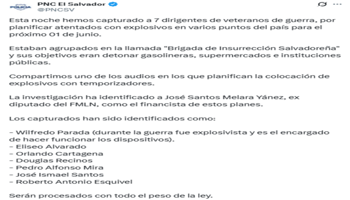 En la noche del 30 de mayo, la Policía Nacional Civil tuiteó: “Esta noche hemos capturado a 7 dirigentes de veteranos de guerra, por planificar atentados con explosivos en varios puntos del país para el próximo 01 de junio”.